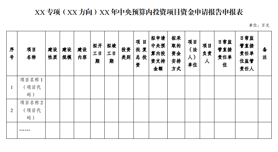 九、对以打捆、切块方式安排中央预算内投资的专项,各省级发展改革委和有关中央单位可汇总编制资金申请报告。其中,以打捆方式安排的专项,具体项目材料应按照上述格式编制,并作为附件一并报送;以切块方式安排的专项,可以不报送具体项目材料。